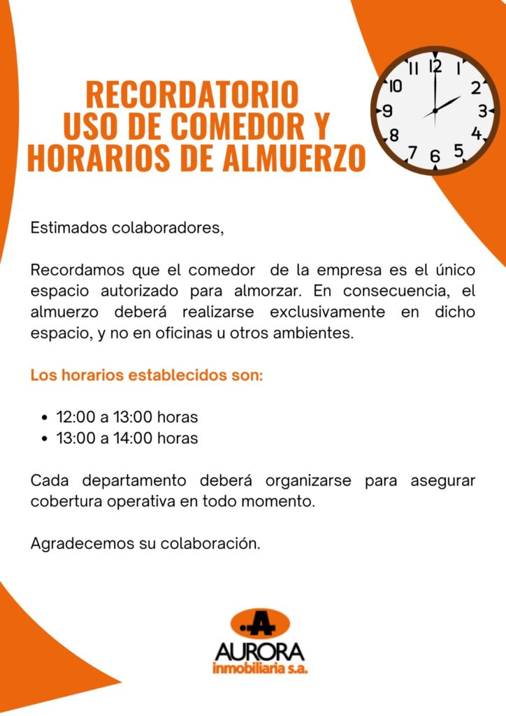 Horarios de almuerzo: 12:00 a 13:00 o 13:00 a 14:00 (según lo coordinado).